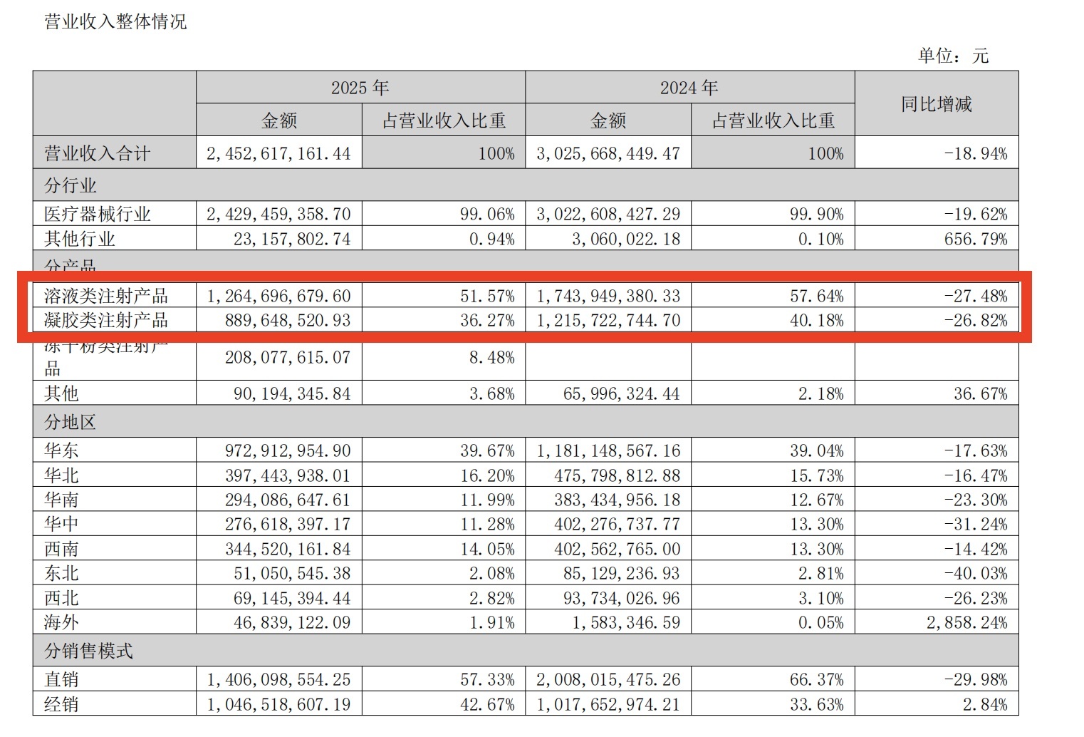 2025年,这一逻辑的脆弱性被充分流露。溶液类打针居品营收12.65亿元,同比下落27.48%;凝胶类居品营收8.90亿元,同比下落26.82%。压力来自多个标的:重组胶原卵白水光类居品在2025年密集获批,以“再生”为叙事逻辑的新一代打针居品启动分流破费者;童颜针赛说念酿成“9家竞争”样式,供给推广导致价钱体系松动,进而蔓延至悉数这个词打针类阛阓;部分卑劣机构借供给足够之机压低采购价,嗨体防守的高溢价空间受到侵蚀,公司笼统全体毛利率从94.64%回落至92.70%。