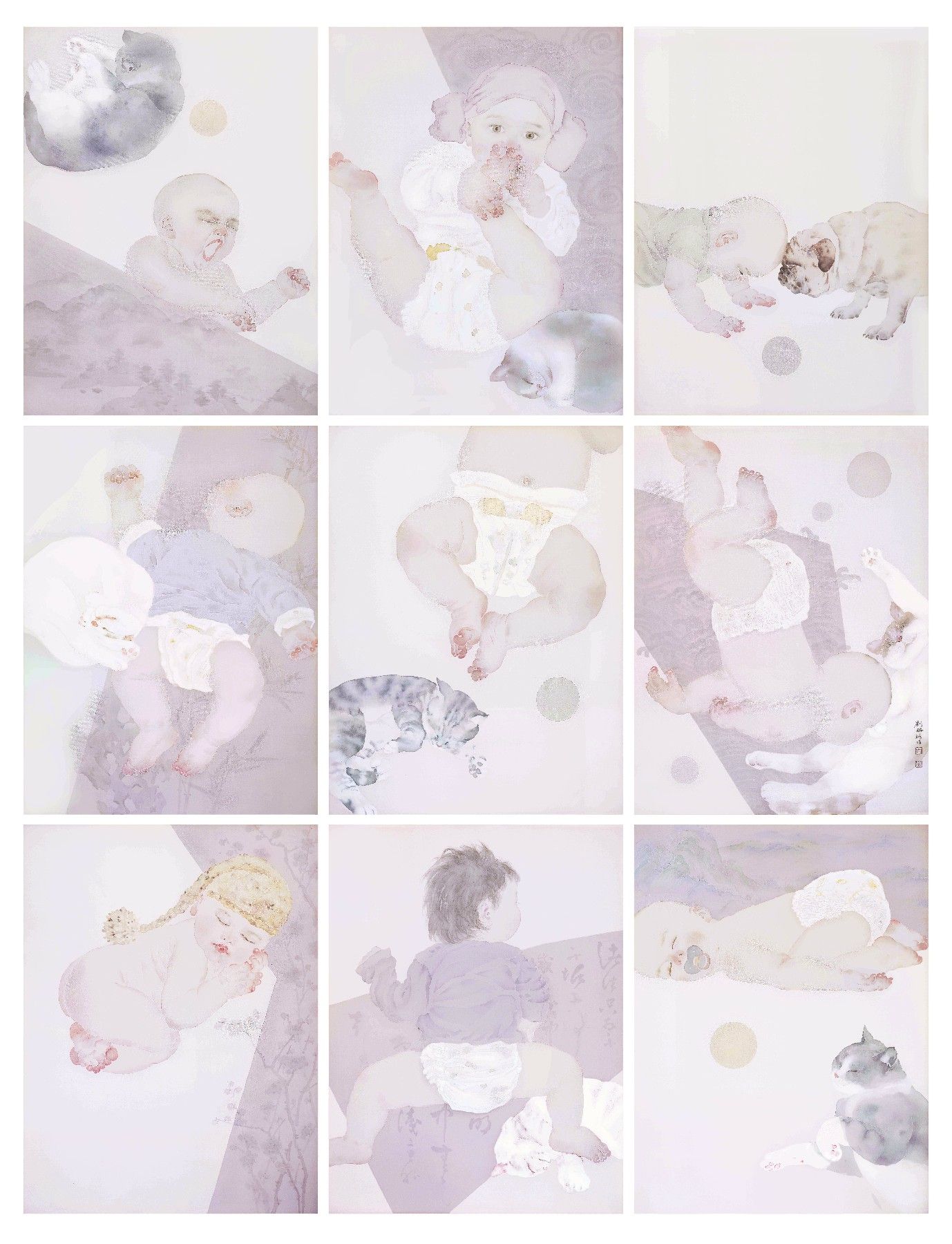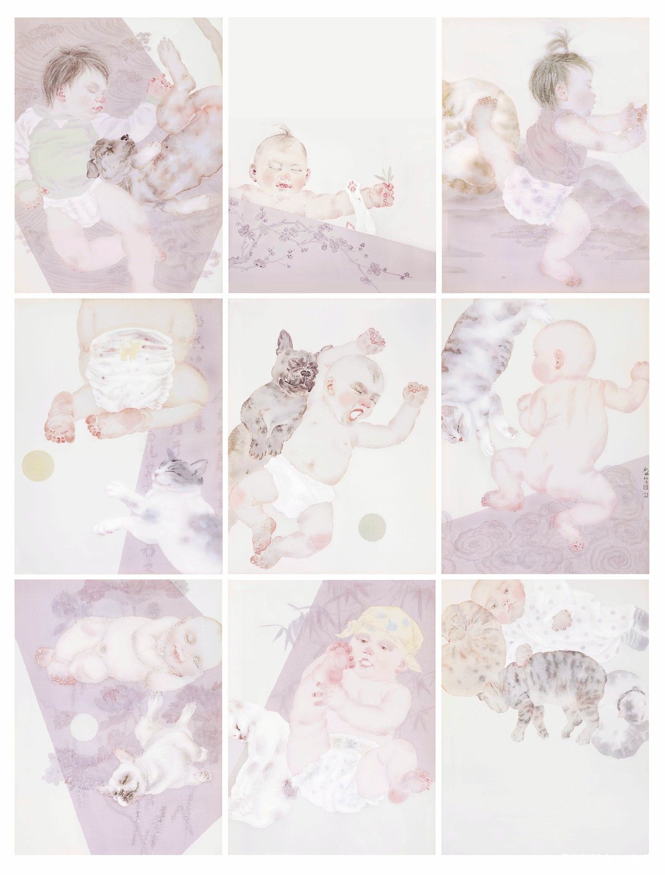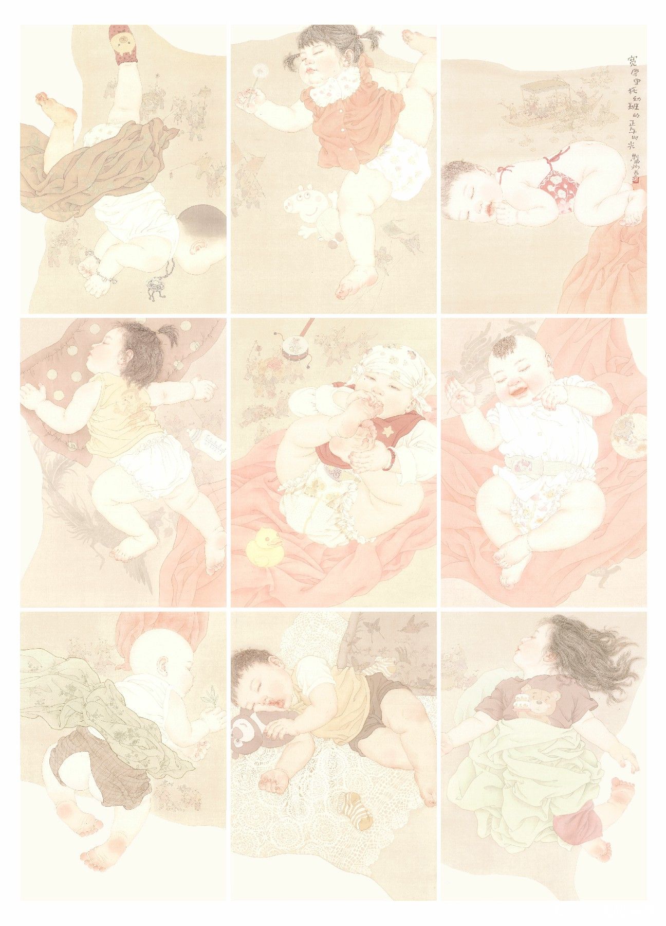 她曾创作的《优容里托幼班的正午时光》入选了第十三届世界好意思展。在绘制技法上固然是经受工笔的勾画渲染门径,但在色斡旋罚、技法发达、立场气质上与没骨画是一致的。所有这个词画面用九宫格的方式画了托儿所正在午睡的九个孩童。阳光透过窗户,倾洒在孩子们的午休空间里,使画面如同蒙上了一层和蔼而亮堂的色调。他们如归拢个个小小的精灵,有的呼呼大睡、有的啃着脚丫,趴着、仰着、圈着,睡眠的姿势各有不同,呼吸起转机伏,似乎齐在梦中作念着各式不同的事儿,暖洋洋的画面更增添了孩子的粉嫩和可儿,闲适而好意思好。画面举座传达出了视觉的簇新感受和特有的艺术审好意思。这种肤浅而好意思好的形状,不单是是画家对履行生涯不雅察和感受的艺术发达,更是她对东谈主性中良善、肤浅一面的陈赞和追求。
