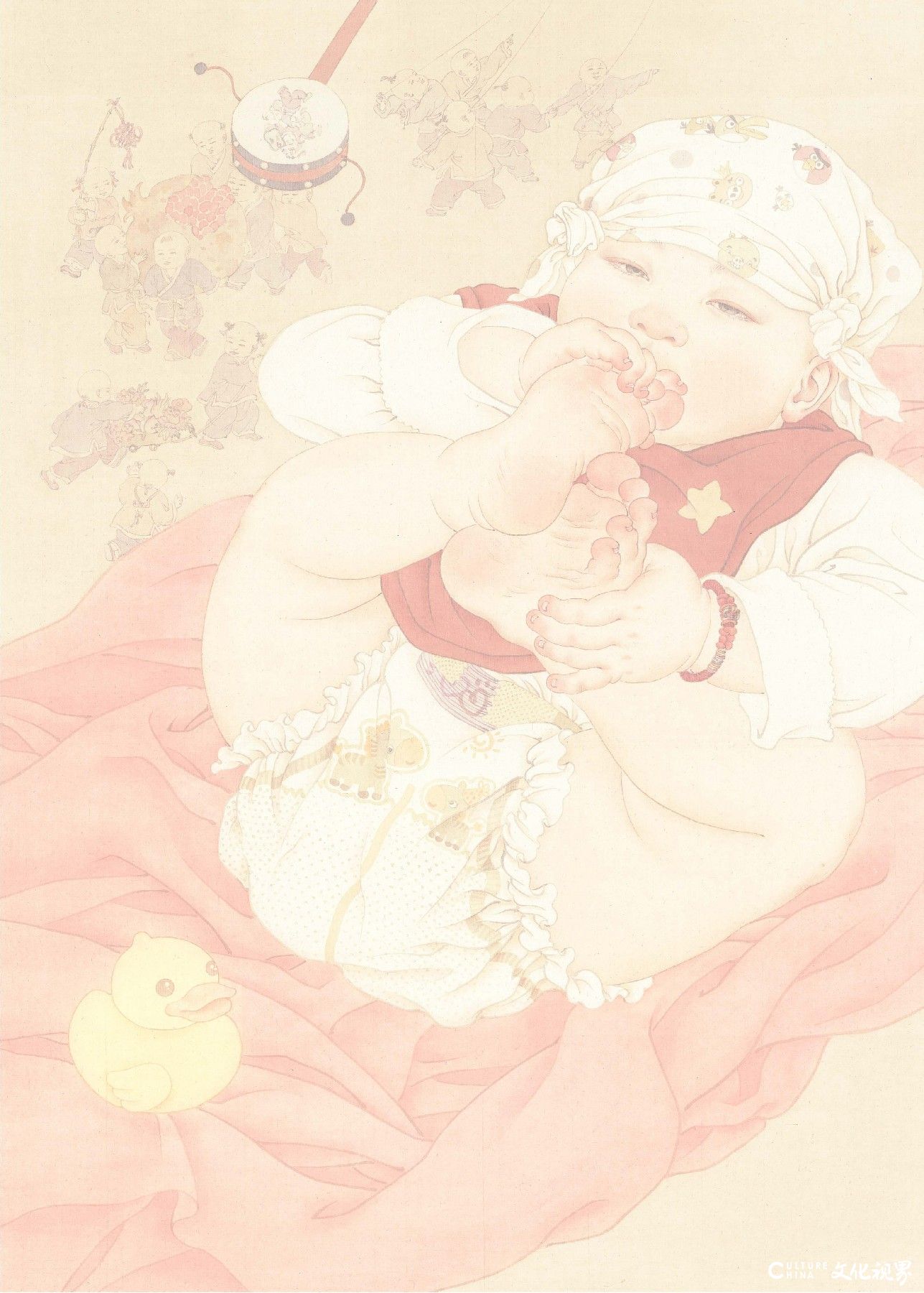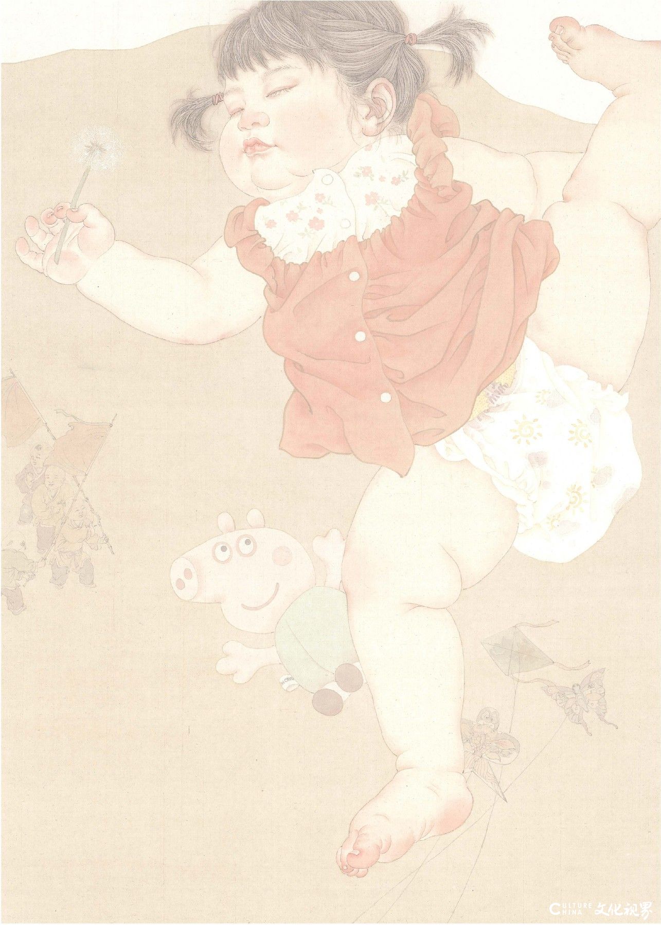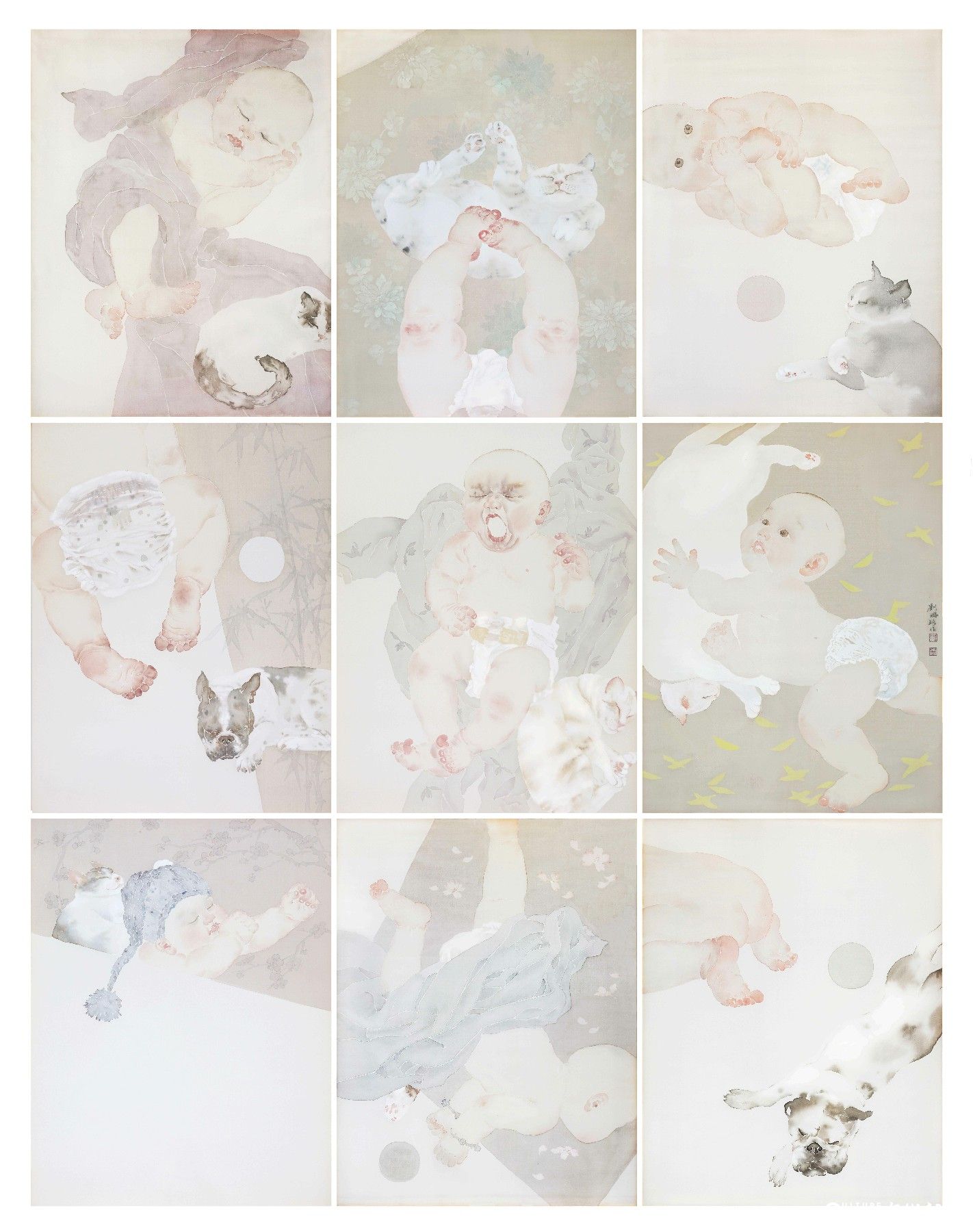 她曾创作的《优容里托幼班的正午时光》入选了第十三届世界好意思展。在绘制技法上固然是经受工笔的勾画渲染门径,但在色斡旋罚、技法发达、立场气质上与没骨画是一致的。所有这个词画面用九宫格的方式画了托儿所正在午睡的九个孩童。阳光透过窗户,倾洒在孩子们的午休空间里,使画面如同蒙上了一层和蔼而亮堂的色调。他们如归拢个个小小的精灵,有的呼呼大睡、有的啃着脚丫,趴着、仰着、圈着,睡眠的姿势各有不同,呼吸起转机伏,似乎齐在梦中作念着各式不同的事儿,暖洋洋的画面更增添了孩子的粉嫩和可儿,闲适而好意思好。画面举座传达出了视觉的簇新感受和特有的艺术审好意思。这种肤浅而好意思好的形状,不单是是画家对履行生涯不雅察和感受的艺术发达,更是她对东谈主性中良善、肤浅一面的陈赞和追求。