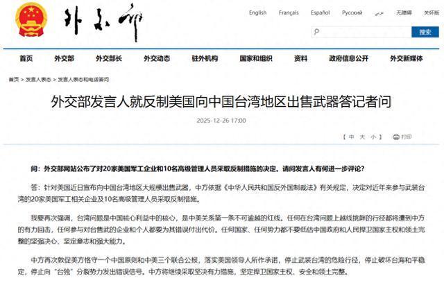 答:针对好意思国近日告示向中国台湾地区大限制出售火器,中方依据《中华东谈主民共和国反番邦制裁法》关系限定,决定对连年来参与武装台湾的20家好意思国军工关系企业及10名高等搞定东谈主员罗致反制依次。