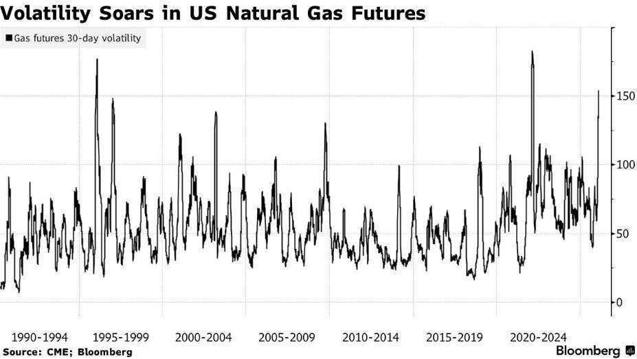 自然气商场的一项波动率概念已升至2022年2月初以来的最高水平,彼时寒潮相同席卷好意思国大部,部分投资者也堕入了需求激增、供应受阻的肖似窘境。在此之前,自然气期货商场自1996年起便未阅历过如斯剧烈的波动。